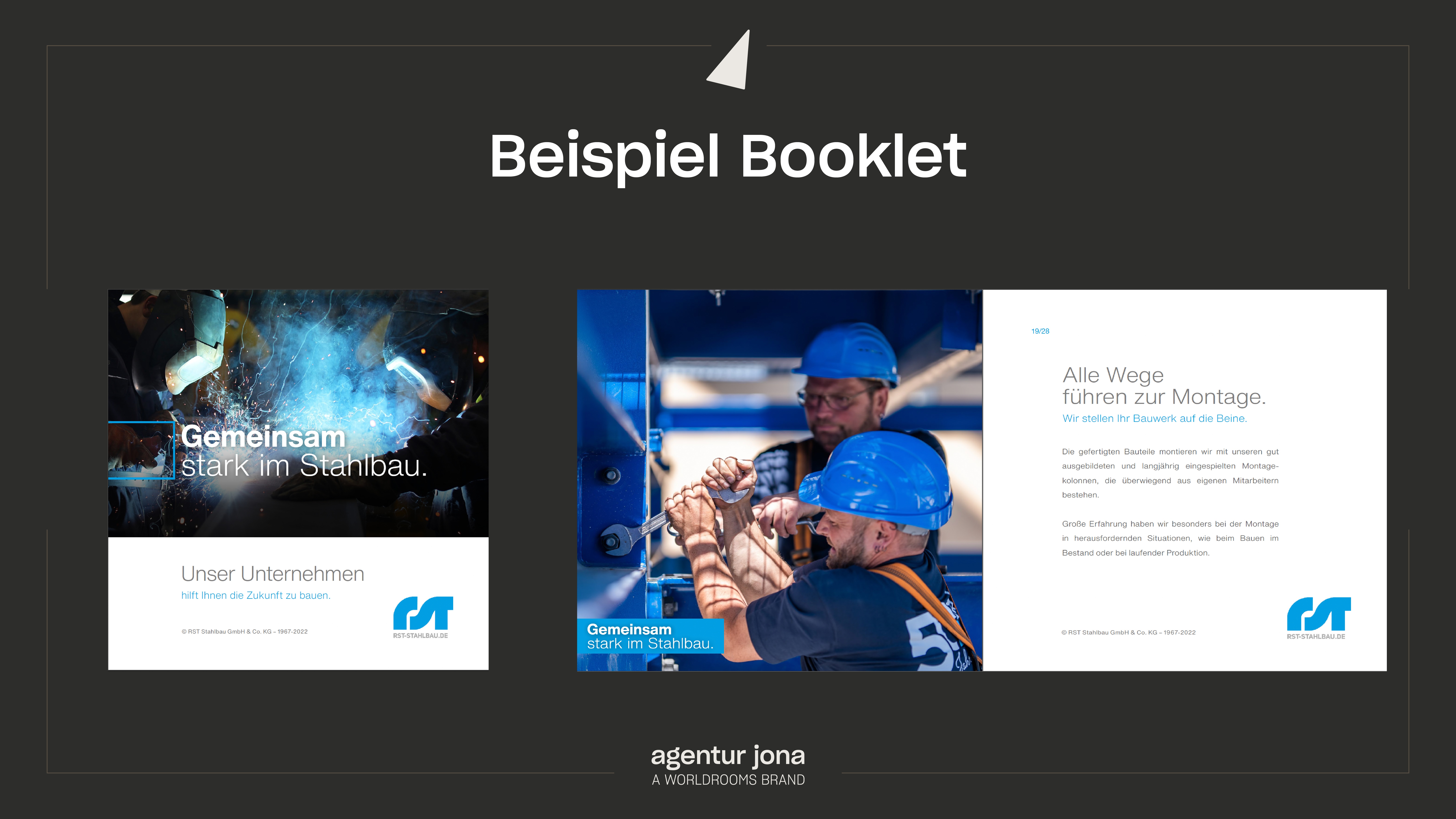 Bei RST Stahlbau haben wir diese Vision in ein Booklet übersetzt. Statt Kulturkampf gab es so einen fließenden Übergang: Alle Bilder zeigen die echte Belegschaft, die neue Ausrichtung wird von innen nach außen getragen – von Mitarbeitenden hin zu Kunden, Partnern und Lieferanten.